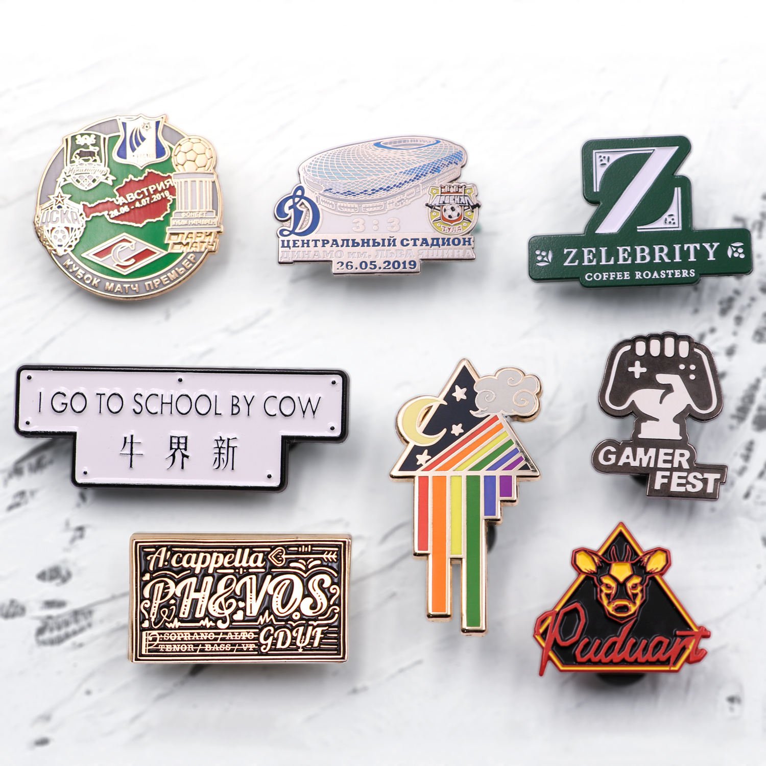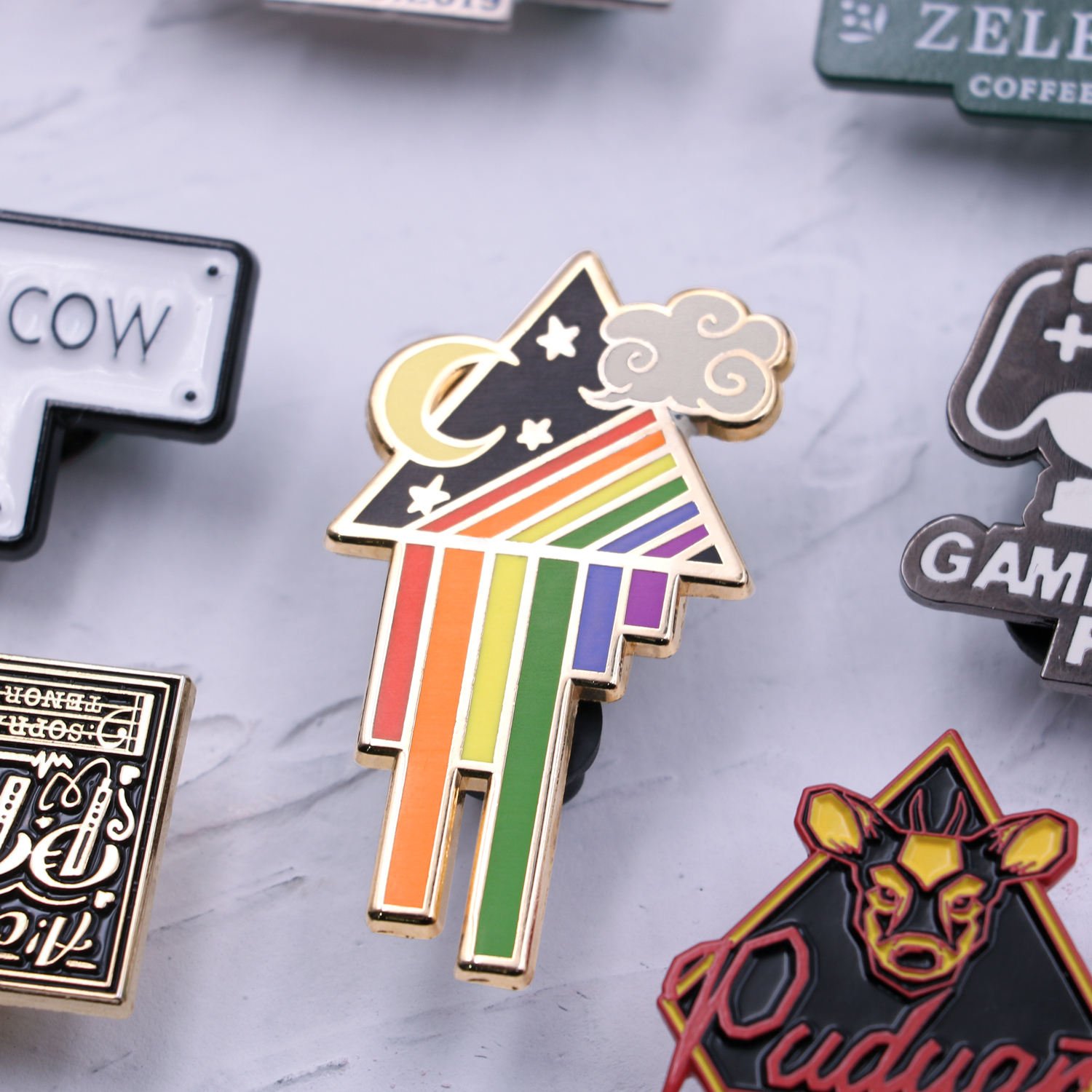 • Soft enamel, hard enamel, or metal finishes
